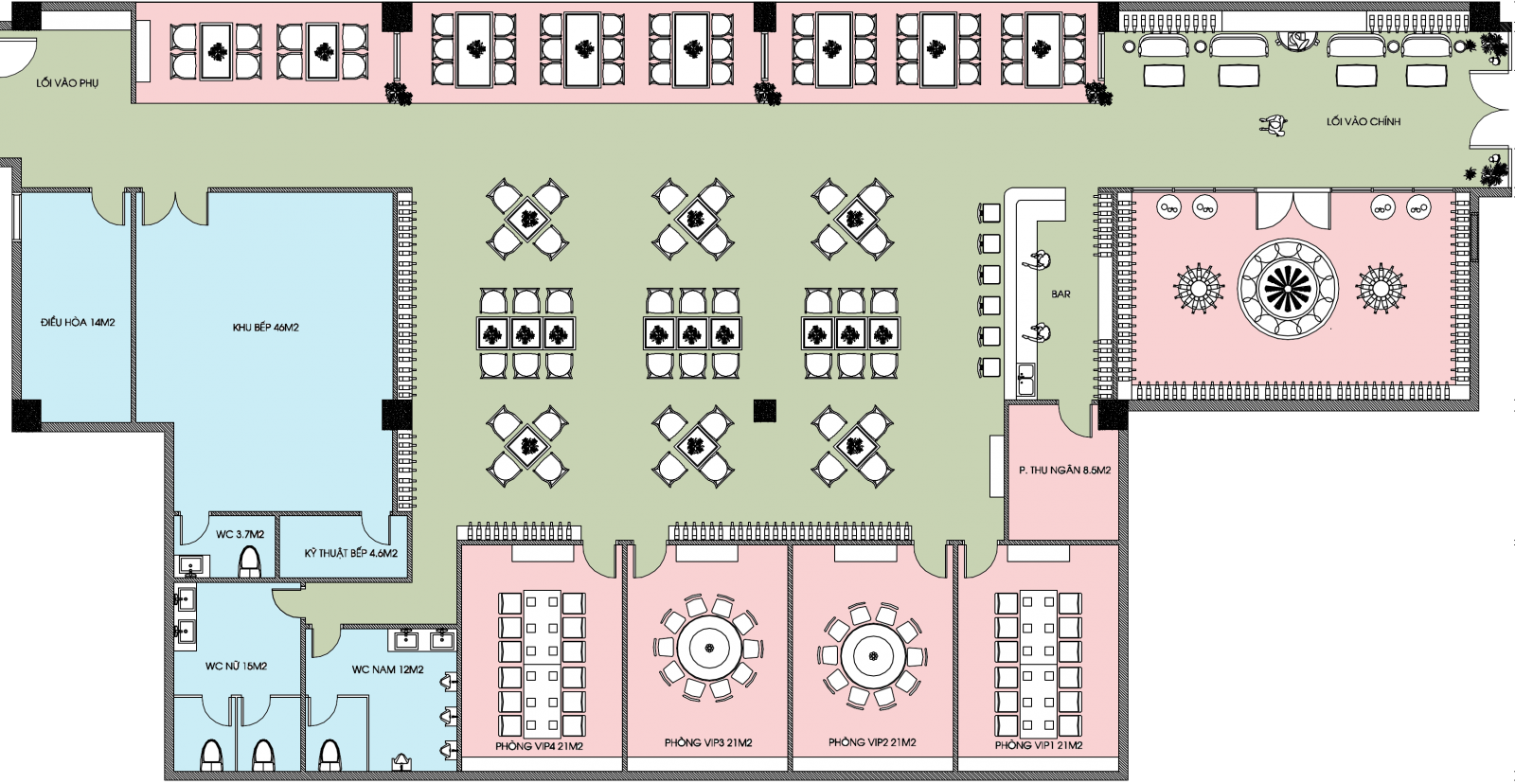 Kết hợp với ý tưởng kinh doanh của CĐT, nội thất Gizago phân chia rõ rệt các không gian sảnh chính, khu ăn chung, tận dụng viu biển, khu vực phòng Vip được sắp xếp khoa học. Khu vực bếp nấu và nội bộ riêng biệt đảm bảo thẩm mĩ.