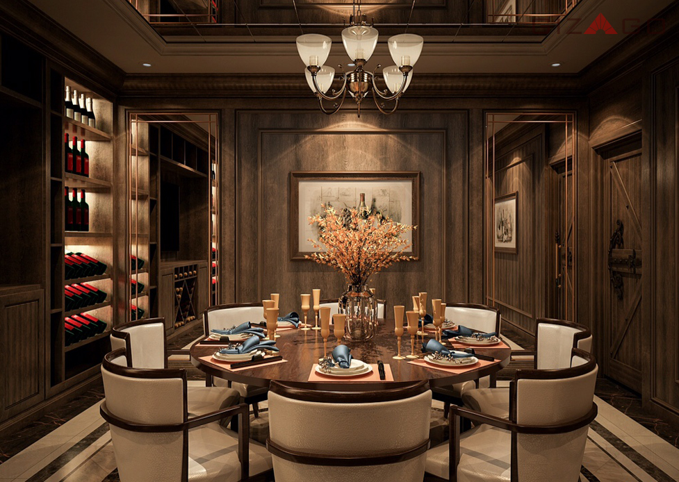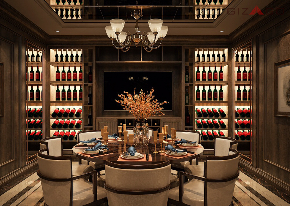 Phong trưng bày rượu sang trọng, có thiết kế bàn thử rượu sang trọng.