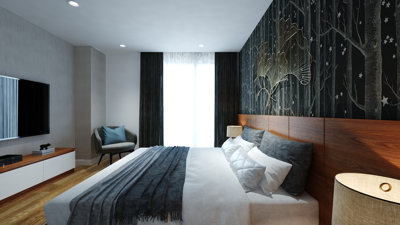 Không gian phòng ngủ được thiết kế tối giản, dễ sử dụng, dùng các vật liệu giấy dán tường tạo sự ấm cúng.